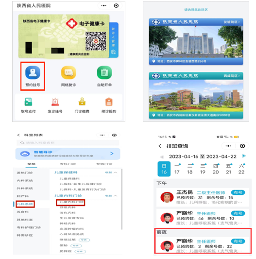 患者通过网上预约,微信搜索“陕西省人民医院”微信小程序;选择就诊院区“友谊院区”;在“儿科系统”中选择“儿童内科门诊”;再选择“前夜专家”点击进入,即可预约儿童夜间专家门诊,夜间号“即约即取”。预约成功后,请按照约定就诊时间前来就诊。