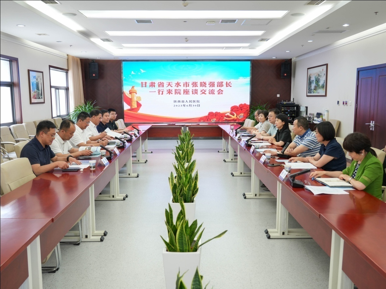 6月30日,甘肃省天水市委常委、市组织部部长张晓强带领市科协党组书记、主席、二级巡视员李凤奇,市委组织部副部长刘彦军,市二院党委书记曹宝国,天水市驻西安办事处主任王勇及市二院医务科副科长王小龙等一行6人来院座谈交流。我院党委书记张玉莲、院长宋张骏、党委办公室主任杨侠、人事处处长徐强、科研处处长彭宁和基层医疗服务部王建军主任等参加了座谈。座谈会由医务处张小玲处长主持。