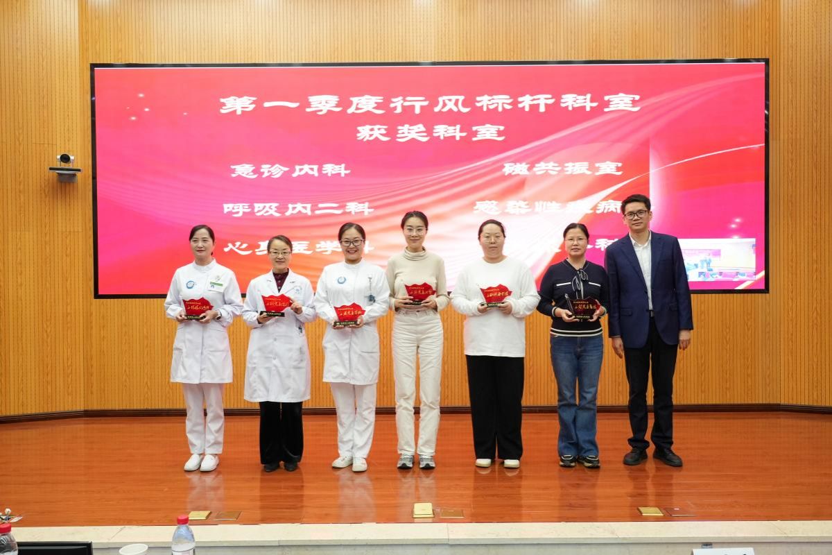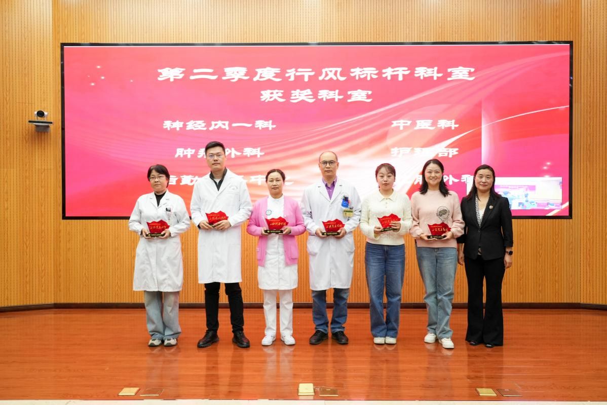 会议还组织了行风标杆科室颁奖活动,共有急诊内科、磁共振室等12个科室荣获2025年第一、二季度行风标杆科室称号。