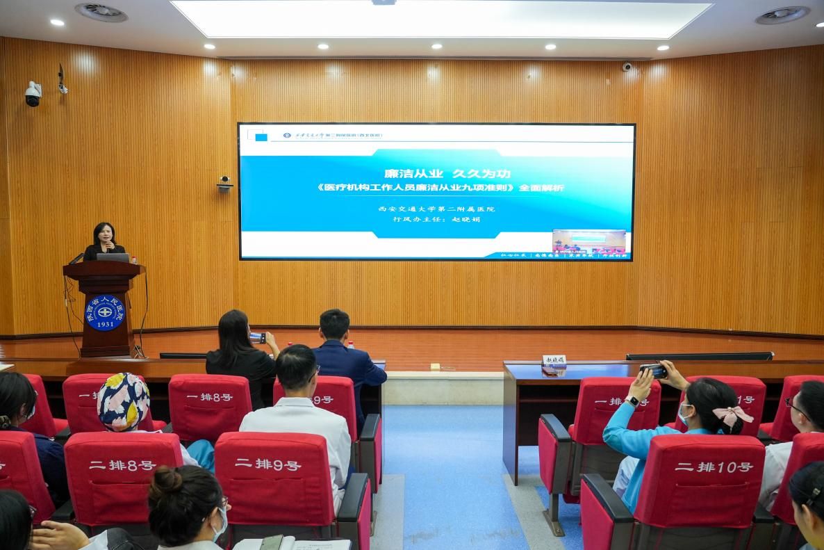 本次培训特邀西安交通大学第二附属医院行风建设办公室主任赵晓娟作《廉洁从业,久久为功 —— 解读 〈医疗机构工作人员廉洁从业九项准则>》专题分享。她结合医疗行业热点与典型案例,从《九项准则》的出台背景、核心要义、实践要求三方面深入解读,对政策条文做了精准解读,并为日常行风管理工作提供了具体指导。