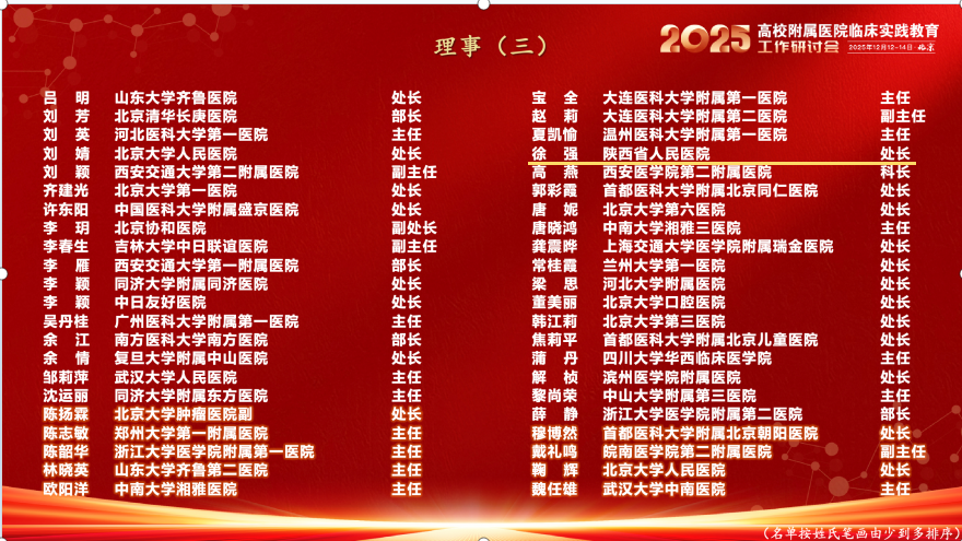近日,由教育部临床实践教学指导分委员会、全国高校附属医院临床实践教育联盟主办的2025年高校附属医院临床实践教育工作研讨会在北京顺利召开。我院作为全国唯一的省政府直属、省卫健委主管的大型公立三甲综合医院获批加入全国高校附属医院临床实践教育联盟,教学处处长徐强当选联盟理事。