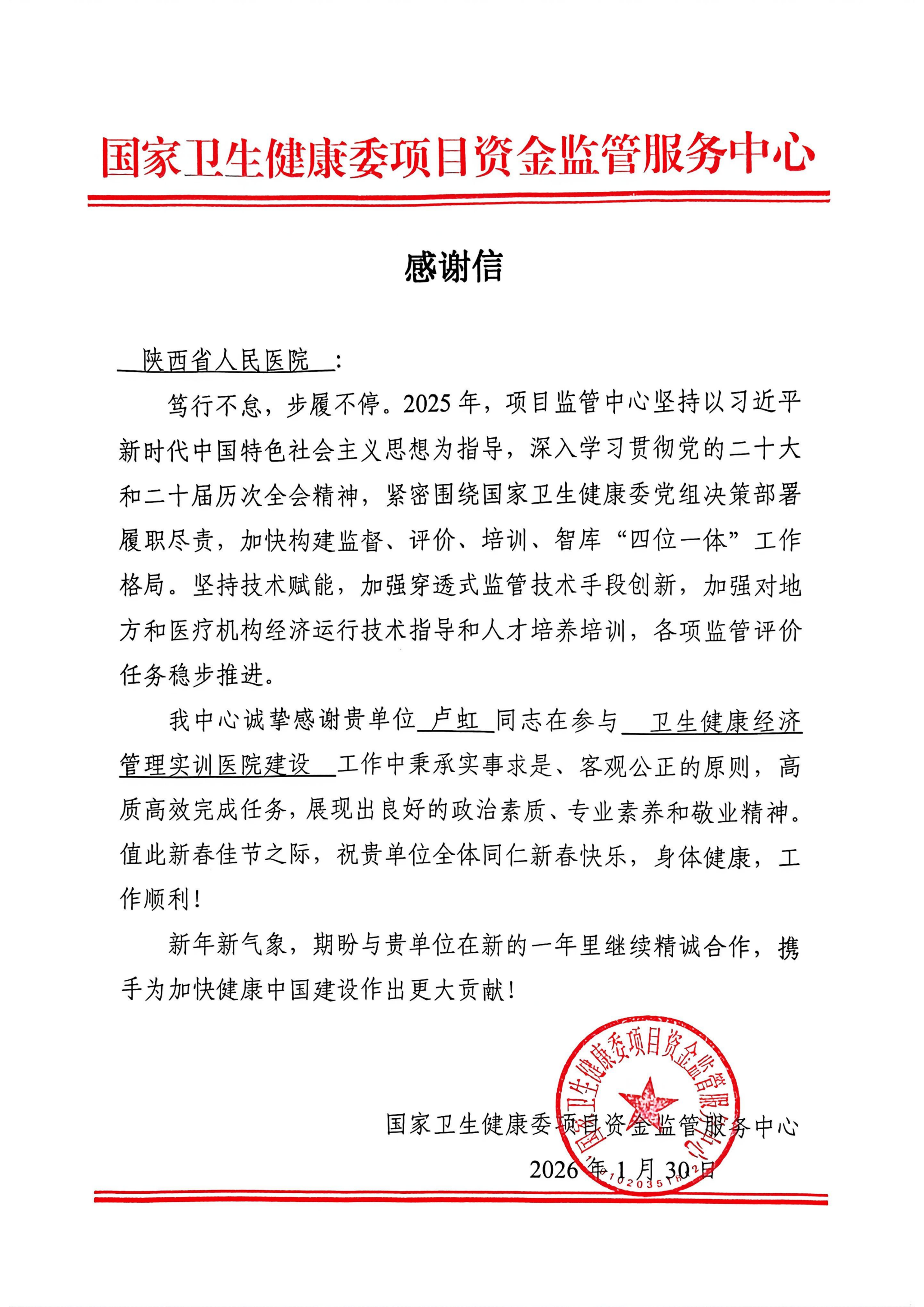 近日,国家卫生健康委项目资金监管服务中心向我院发来三封感谢信,对我院在卫生健康经济管理领域人才队伍建设,特别是经济管理实训医院试点建设工作中所做出的积极贡献给予高度肯定。
