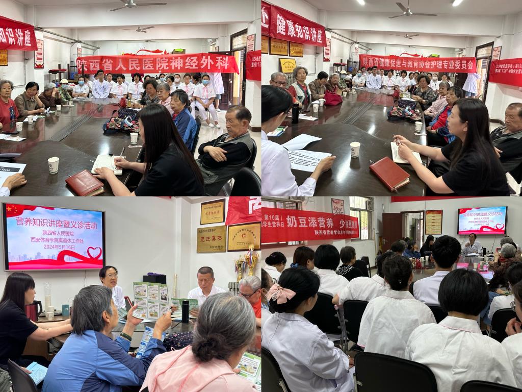 为贯彻落实《健康中国行动(2019-2030年)》《国民营养计划(2017-2030年)》《老年营养改善行动(2022-2025年)》纲要,5月16日上午,由陕西省人民医院神经外科牵头,陕西省健康促进与教育协会护理专业委员会,陕西省营养学会老年与慢性病管理分会,陕西省人民医院营养科、普外科、重症医学科等多学科专家协作,联合西安体育学院离退休工作处在西安体育学院为离退休职工举办“2024年全民营养周”义诊活动。本次活动以“奶豆添营养,少油更健康”为主题,旨在提高公众对合理膳食的认识和重视。