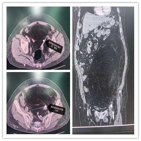 患者为老年女性,因腹胀不适来院就诊。影像学检查提示其腹膜后存在一长径超过40公分的巨大肿瘤,肿瘤已完全包裹左侧腰大肌、髂外动静脉,侵犯髂肌,左侧输尿管显示不清;腹盆腔脏器及腹主动脉明显移位。肿瘤血供丰富,左侧髂内动脉及部分腰动脉参与供血,手术难度极高。