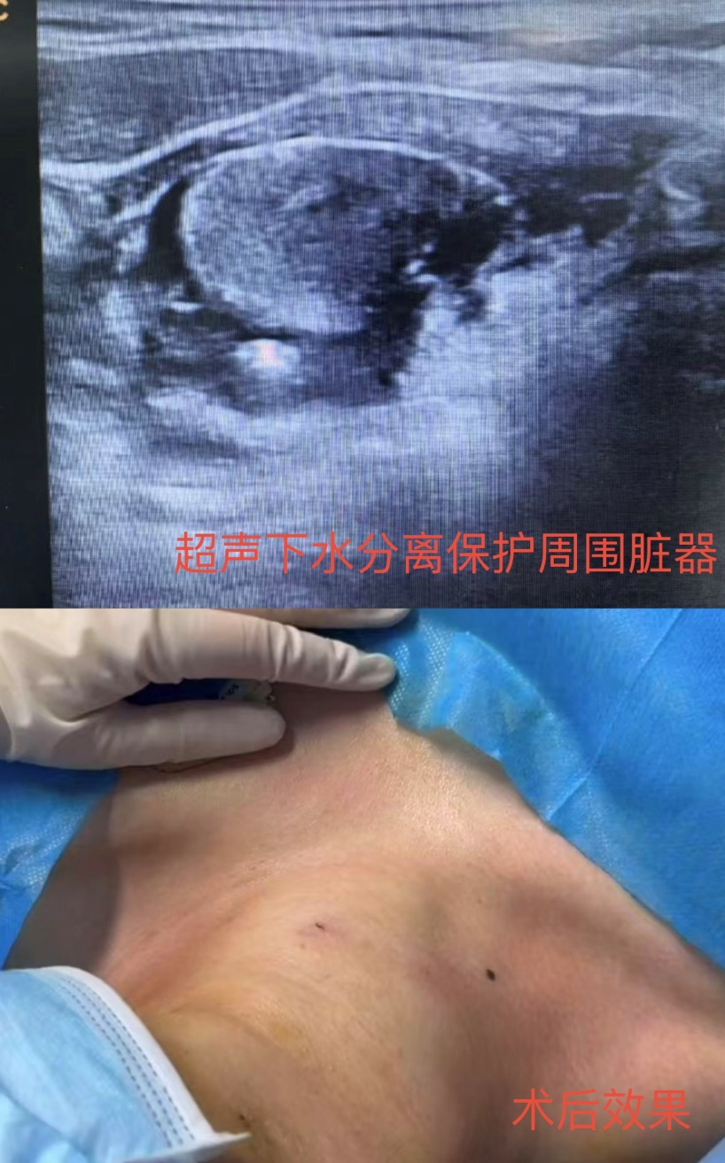 此次接受治疗的患者为 65 岁女性,因长期腰背部疼痛、重度骨质疏松就诊,经检查确诊为右侧直径 2cm 甲状旁腺腺瘤。考虑到患者合并严重冠心病,无法耐受全麻及传统开放手术,治疗团队在充分评估病情、与患者及家属详细沟通后,决定为其实施局麻下超声引导射频消融术。术中,团队运用水分离技术精准保护周围神经与血管,手术全程无切口、不留瘢痕,真正实现微创治疗。术后 20 分钟,患者甲状旁腺激素即恢复正常,术后 2 天顺利出院。