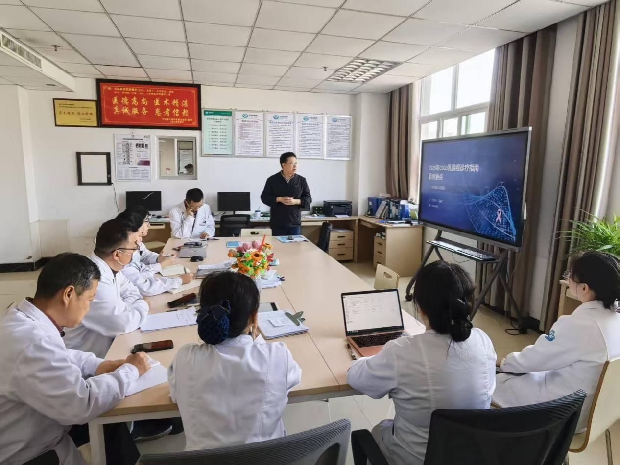 学术交流环节,韩炜副主任医师以《2025ATA甲状腺癌外科诊疗及随访策略更新》为题作专题讲座,结合ATA甲状腺癌诊疗指南更新内容,系统梳理甲状腺癌外科治疗理念及术后随访管理要点,分享规范化、个体化诊疗思路。马刚博士围绕《2026年CSCO乳腺癌诊疗指南更新要点》,重点解读乳腺癌诊疗领域的新理念、新标准及临床应用细节,为基层医务人员精准把握指南内容提供了有力参考。