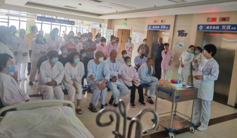 首先由护士情景模拟一段患者跌倒坠床的场景,在场的家属患者提出发生跌倒的原因,患者及家属踊跃发言,找出风险点。最后由刘鑫护士从跌倒坠床的危害性、哪些患者容易发生跌倒坠床、怎样预防跌倒坠床展开生动详细的讲解。