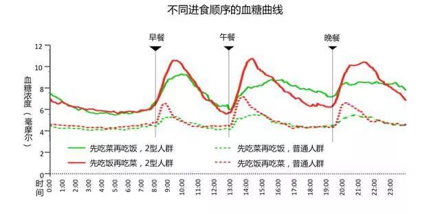 在糖尿病患者中所进行的干预研究显示,与先吃主食后吃蔬菜(500g/d)/荤菜的进餐顺序相比,先吃蔬菜/荤菜后吃主食,其餐后血糖、胰岛素水平显著降低,进一步研究显示,按照蔬菜--荤菜--主食的进餐顺序可降低餐后血糖波动。长期坚持,还可使2型糖尿病患者餐后血糖及糖化血红蛋白水平显著降低。因此改变进餐顺序,按照蔬菜--肉--主食的顺序进餐,利于糖尿病患者短期和长期血糖控制。
