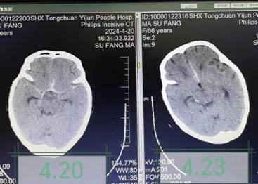 患者入院前2天蛛网膜下腔出血于西安某三甲医院神经外科ICU住院治疗,期间突然陷入深昏迷,且患者高龄、一般状况差、生命体征不稳定,主管医生告知家属患者病情极其危重,无手术机会,继续治疗意义不大。面对这一沉重打击,患者家属万念俱灰,放弃在西安继续治疗,转回宜君县人民医院拟行姑息治疗。了解病情后,医疗团队详细查阅患者病历资料,认真细致查体,患者生命体征不平稳,深昏迷状,疼痛刺激无反应,颈项强直。经讨论分析,患者突发昏迷的原因可能为再出血及脑血管痉挛,同时存在代谢性酸中毒、肺炎、电解质紊乱等影响脑功能,充分评估后,团队建议进行腰椎穿刺及脑脊液置换术。经与家属详细沟通,征得同意后连夜安排手术。手术由神经内科主治医师李妮妮操作,术中可见血性脑脊液流出,经多次脑脊液置换,脑脊液血色逐渐变淡,约半小时顺利结束手术。术后继续给予止血、营养神经、抗感染、纠酸、呼吸支持等综合治疗。在医护人员的精心照料下,次日查房患者意识转清,头痛症状明显缓解,能够与家属及医护人员正常交流,四肢活动也有明显恢复,复查颅脑CT显示出血及水肿情况较前减轻。经过3天巩固治疗,患者病情基本稳定。面对患者奇迹般的恢复,家属对治疗团队的敬业精神和高超医术表示惊叹及深深的感谢。