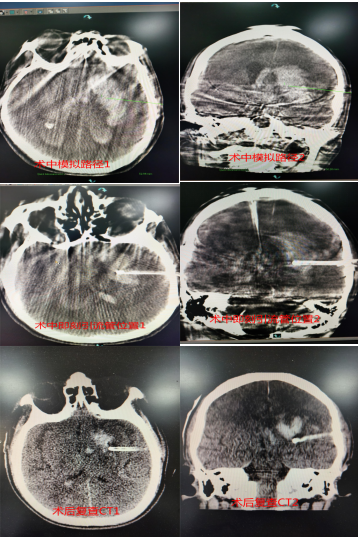 患者为64岁男性,以“突发意识障碍6小时”主诉入院,颅脑CT平扫示左侧基底节区脑出血,量约50ml,患者意识不清,颅内出血量大且中线偏移明显,手术指征明确,为及时高效地给予患者治疗,李帅和科室医生经过与家属反复沟通协商,最终决定行“DSA引导下颅内血肿钻孔引流术”。术中患者仰卧位行DynaCT并标记和模拟穿刺路径、方向及深度,经皮锥颅后,按预先模拟路径将引流管穿刺至血肿中心部位,再次行DynaCT明确引流管位置,缓慢抽吸出约20ml暗红色血肿,留置引流管于血肿腔并固定,术后持续引流5天后复查示大部分血肿消失,给予拔出引流管,患者恢复顺利。